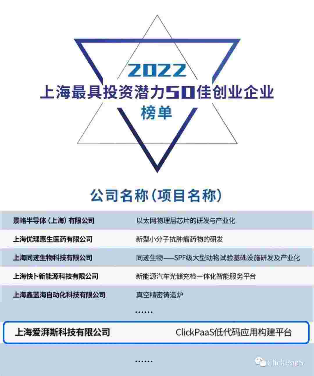 华为钱包 作为国内低代码PaaS平台的领军企业,,,,,,,,,,与120家创企入围角逐。。。。。。期间接受了来自德同资本、、、、领中资本等知名投资机构的10位投资人组成专家评委团的背靠背盲选。。。。。。并最终入围“2022上海最具投资潜力50佳创业企业”榜单,,,,,,,,,,,被列入“上海市重点培育创业企业库”。。。。。。。。。。。。