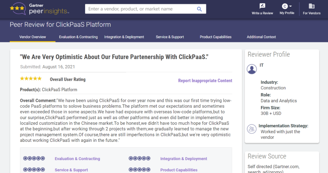 Tips:::::::::::::【Peer Insights】——用户对企业IT产品和服务发布真实评价的平台。。。。。目前已有355个市场,,,,,,,,,,,,,,,,255,000条经过验证的评价。。。。。。。。。。。。每一条评价Gartner会针对参评企业营收规模及参评人员信息做验证、、、、、评价内容做多维核实。。。。。。。。。。。。。。
